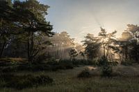 Landschap op natuurgebied Planken Wambuis in Ede, op de Veluwe in Gelderland. De nevel en de opkomende zon zorgen voor prachtig licht tussen de bomen.