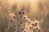 Close up van Erica tetralix, ofwel gewone dopheide, een wildgroeiend plantje op de heide. De foto is gemaakt in het gouden licht van de opkomende zon.