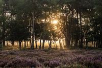 Landschap op natuurgebied Planken Wambuis, op de Veluwe in Gelderland. Er hangt nevel over het veld, en de zon schijnt door de bomen over de bloeiende heide.