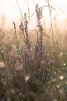Closeup van de bloeiende heideplant, die in het gouden licht van de opkomende zon staat. Door de dauwdruppels en het zonlicht vertoont zich een prachtige bokeh.