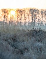 Landschap op de heide van Planken Wambuis, in Ede, op de Veluwe in Gelderland. De zon komt op, tijdens een koude winterochtend. Het zonlicht werpt een warme gloed over de natuur.