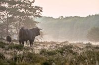 Landschap op natuurgebied Planken Wambuis in Ede, op de Veluwe in Gelderland. Je ziet een stier met een kalfje, in het gouden ochtendlicht.