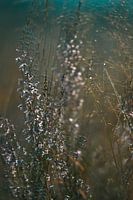 Close up van bloeiende heide in het zonlicht. De foto is bewerkt in bruine tinten met een vleugje aqua blauw bovenaan.