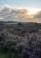 Landschap op natuurgebied Planken Wambuis in Ede, op de Veluwe in Gelderland. De heide staat volop in bloei. De zon verschijnt achter de wolken.