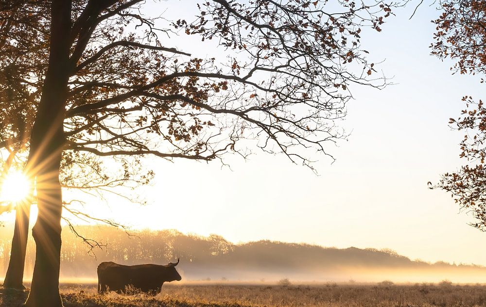 landschap op natuurgebied Planken Wambuis in Ede, op de Veluwe in Gelderland, waar een koe staat, met op de achtergrond de paarden in een nevelig weiland bij zonsopkomst