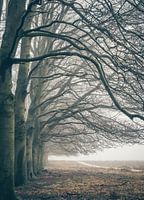 Landschap op de heide van Planken Wambuis in Otterlo, op de Veluwe in Gelderland, met zicht op een bomenrij, op een mistige winterochtend