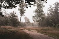 landschap bij Planken Wambuis in Ede, Gelderland, met een wandelpad over het heidegebied, en een grijze heiige lucht