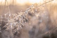 Close up op het natuurgebied Planken Wambuis in Otterlo, op de Veluwe in Gelderland. Het wildgroeiend plantje is bedekt met een laagje rijp. Het licht van de opkomende zon werpt een gouden laagje over het geheel.