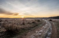 Landschap op het natuurgebied Planken Wambuis in Otterlo, op de Veluwe in Gelderland. De begroeiing en het wandelpad zijn bevroren, terwijl de zon langzaam opkomt en de lucht mooi oranje kleurt.
