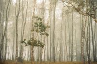 Landschap gemaakt op natuurgebied Planken Wambuis in Ede, op de Veluwe in Gelderland. Je ziet enkele slanke berkenbomen in de ochtendmist.