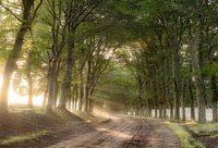 landschap op de Planken Wambuis in Ede, Gelderland, met een wandelpad waar het felle licht van de opkomende zon stralen tussen de bomen werpt