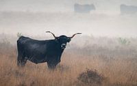 Landschap op natuurgebied Planken Wambuis in Ede, op de Veluwe in Gelderland. Het is een mistige herfstochtend en op de heide staat een wilde stier.