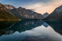De Plansee in Oostenrijk, een prachtig, groot bergmeer met een adembenemende achtergrond. s Nachts is het hier extreem donker, zodat je de sterren en zelfs de Melkweg gemakkelijk met het blote oog kunt zien. De foto is genomen vóór de opname met de Melkweg en laat de sfeer zien kort na zonsondergang.