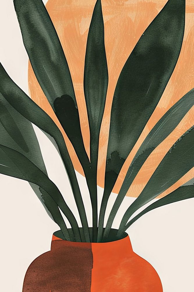 Dit schilderij toont een gestileerde plant in een oranje pot voor een fel oranje zon. De levendige groene tinten van de bladeren harmoniëren prachtig met de warme tinten van de achtergrond, waardoor een levendig maar rustgevend effect ontstaat. De heldere lijnen en minimalistische voorstelling geven de afbeelding een moderne esthetiek. Geïnspireerd door abstracte kunst brengt dit werk de essentie van natuur en licht in een hedendaagse context.