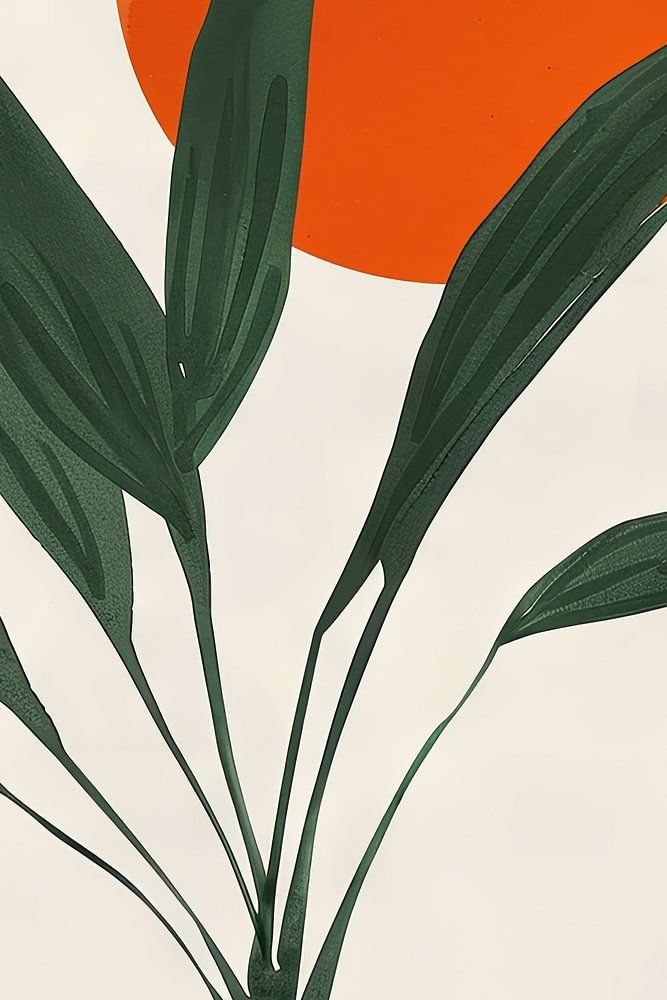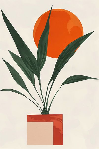 Dit schilderij toont een gestileerde plant in een oranje pot voor een fel oranje zon. De levendige groene tinten van de bladeren harmoniëren prachtig met de warme tinten van de achtergrond, waardoor een levendig maar rustgevend effect ontstaat. De heldere lijnen en minimalistische voorstelling geven de afbeelding een moderne esthetiek.…