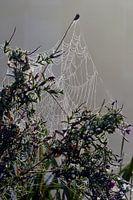 Planten in de ochtend mist met dauw druppels op spinnenweb in de natuur