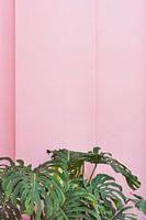 Monstera plant tegen de roze muur van appartmentencomplex La Muralla Roja in Calpe, Spanje.