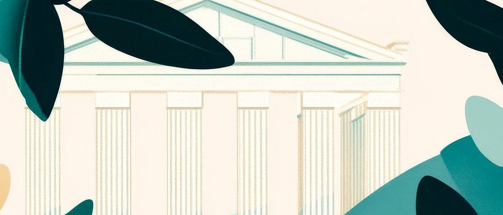 Een harmonieus samenspel van zachte groene tinten en elegante bladeren omlijst een majestueuze architectuur die rust en stijl uitstraalt. Deze subtiele compositie creëert een sfeer van sereniteit en zou perfect passen in een woonkamer, waar het een gesprek kan inspireren en de zintuigen kan kalmeren.