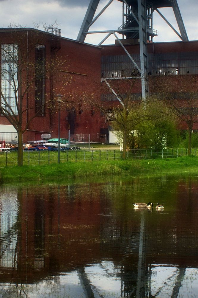 De slingertoren van de kolenmijn Ewald in Herten wordt weerspiegeld in een plas water in een overloopbekken.