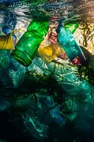In de fascinerende diepten van het water ontvouwt zich een speels kleurenspel van heldergroene en blauwe plastic flessen die dansen tussen glinsterend zeegras. Deze indrukwekkende onderwaterwereld trekt de aandacht en zet aan tot nadenken - ideaal voor een creatief kantoor of een tot nadenken stemmende leeshoek in de woonkamer.