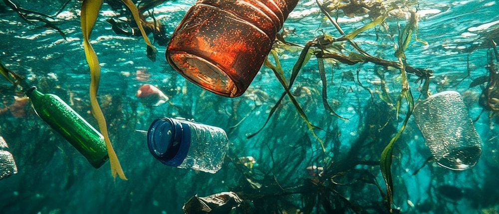 De dramatische kleuren van plastic afval en verdwaalde algen ontvouwen zich te midden van het mysterieuze onderwaterrijk. De zonnestralen breken door het wateroppervlak en creëren een melancholische stemming. Dit krachtige beeld is perfect voor een milieubewuste woonkamer of studeerkamer om na te denken over duurzaamheid.