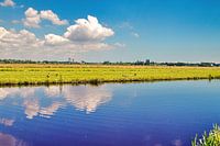 Polderlandschap op zomerse dag met reflectie van wolken in het water