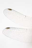 De vleugels van de platbuik libel van heel dichtbij gefotografeerd met de macrolens. Door de witte achtergrond komen de vleugels van de libel prachtig uit. De details van de vleugels zijn zo goed zichtbaar dat er een abstract beeld ontstaat.
