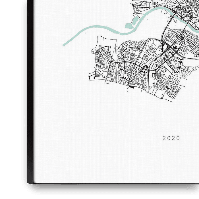 Minimalistische plattegrond van de bebouwde kom van Arnhem, weergegeven in de de vorm van het stratenpatroon en herkenbaar gemaakt met de rivier de Rijn en de IJssel en een aantal hoofdwegen.