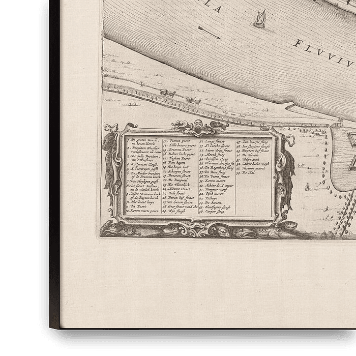 Plattegrond in vogelvluchtperspectief. Linksboven titelcartouche, linksonder legenda. Rechtsboven cartouche met opdracht, daarboven drie wapens waaronder het wapen van Kampen en het wapen van Overijssel. Op verso Latijnse tekst.