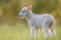 Landschap op het platteland in Heteren, op de Overbetuwe in Gelderland, waar een jong lammetje in het weiland staat, tijdens het gouden uurtje voor zonsondergang. Het kijkt naar de andere lammetjes.