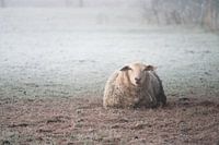 Portret van een schaap op een bevroren weiland. Het is een mistige en koude winterochtend.