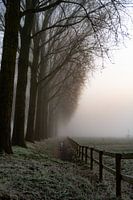 Landschap op het platteland in Homoet, op de Overbetuwe in Gelderland. Het is winter, alles is bedekt met een laagje rijp en het is mistig.