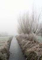 Landschap op het platteland in Homoet, op de Overbetuwe in Gelderland. Het is winter, alles is bedekt met een laagje rijp en het is mistig.