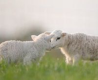 Landschap op het platteland in Heteren, op de Overbetuwe in Gelderland, waar twee jonge lammetjes elkaar besnuffelen in het weidegras, wat voor een schattig tafereel zorgt. Eén lammetje kijkt in onze richting.