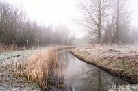Landschap op het platteland in Homoet, op de Overbetuwe in Gelderland. Het is winter, alles is bedekt met een laagje rijp en het is mistig.