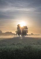 Portret in Homoet, Overbetuwe in Gelderland, met zicht op een boom in een weiland, waarachter de zon opkomt, die door de nevel prachtige zonneharpen werpt door de takken van de boom.