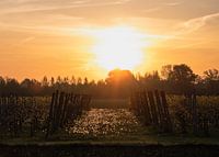 Landschap in Homoet bij zonsopkomst. Je ziet een boomkwekerij onder een oranje heldere hemel. Tussen de bomen staan duizenden uitgebloeide paardenbloemen die glinsteren in het felle zonlicht.