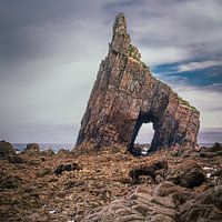Een vierkante 1:1 foto met uitzicht op de natuurlijke boog bij Playa de Campiecho (alleen te bezoeken bij eb).