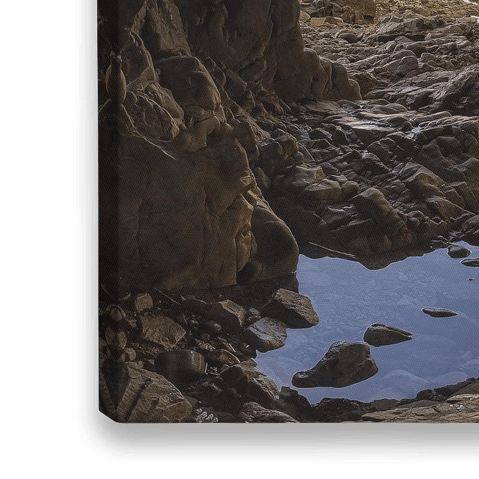 Panoramisch uitzicht op de natuurlijke boog bij Playa de Campiecho (alleen te bezoeken bij eb), gezien vanuit een grot.