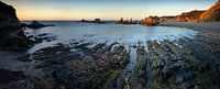 Panorama van Playa de Gueirua rotskust met kliffen op achtergrond bij zonsondergang, Asturië, Spanje