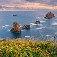 Een vierkante 1:1 foto van een ochtend bij de rotsformaties Urros de Liencres nabij Playa de la Arnía, beter bekend als Arnía, een strand in het natuurpark van de Dunas de Liencres en Costa Quebrada, tussen de gemeenten Piélagos en Santa Cruz de Bezana, in de autonome gemeenschap Cantabrië, Spanje.