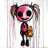 Het beeld past goed bij het concept van een speelse maar tegelijkertijd een beetje macabere uitstraling. De speelse uitstraling van het meisje met haar teddybeer, de gedurfde, minimalistische stijl, en de druppels die de achtergrond sieren, geven een dieper gevoel van mysterie en een beetje 'duisternis'. Gezien de esthetiek, waarin het…
