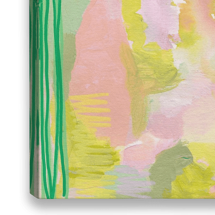 'Playful Spring' is een vierkant schilderij met groen en roze tinten. Het heeft een dromerige en frisse uitstraling, perfect om een vleugje lente en vrolijkheid in je ruimte te brengen.