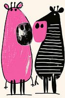 Playtime in Pink and Black - Dit abstracte dieren schilderij toont twee gestileerde fantasiedieren, de een felroze met grote ovale ogen en een speelse uitstraling, de ander zwart met witte strepen en roze details, beide vereenvoudigd met duidelijke contouren en expressieve kleine details zoals oren en pootjes.
