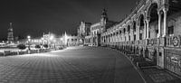 Een zwart-wit foto van een vroege ochtend op Plaza de España, een van de bekendste pleinen van Sevilla.