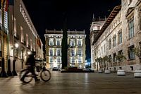 Voetganger met fiets op het Plaza de Manises in Valencia Spanje bij nacht