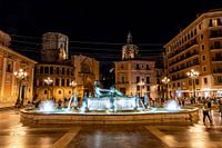 Nachtopname fontein op Plaza de la Virgen in Valencia Spanje