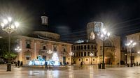 Plaza de la Virgen met Turia Fontein en Basilica Kathedraal in Valencia Spanje bij nacht