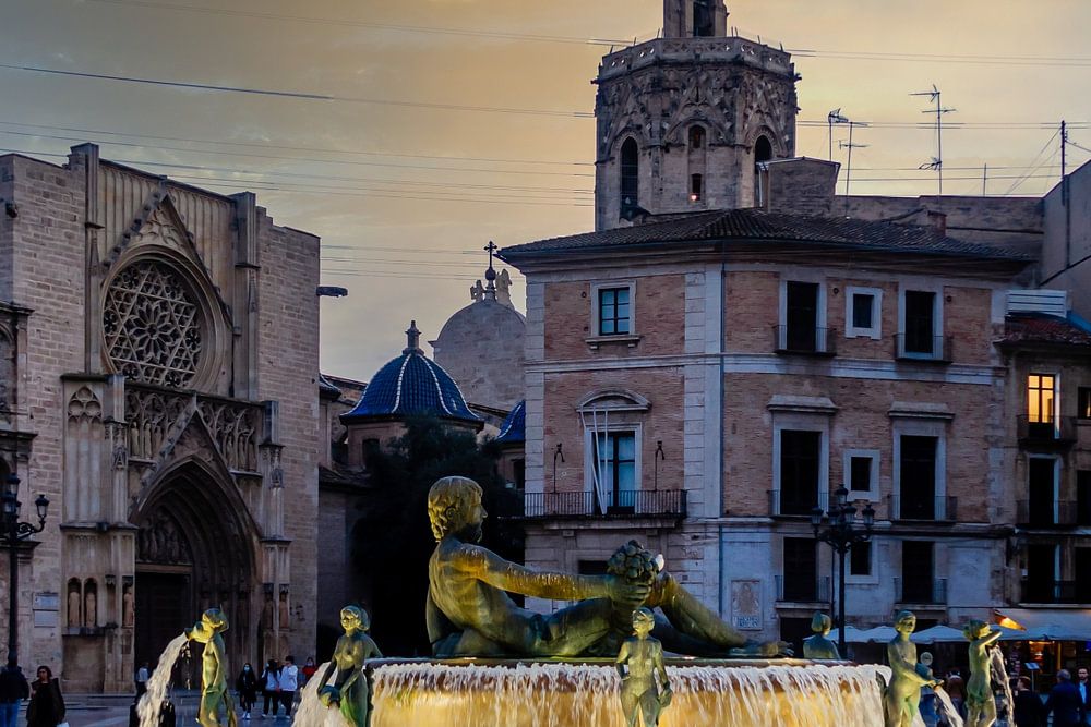 Plaza de la Virgen met Turia Fontein en Basilica Kathedraal in Valencia Spanje