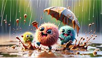 De foto toont een vrolijke scène waarin drie pluizige monsters in de regen spelen. De centrale figuur, een levendig monster met oranje vacht, houdt een haveloze bruine paraplu omhoog die meer symbolisch lijkt dan nuttig. Zijn uitbundige gezichtsuitdrukking en opgeheven armen stralen een zorgeloze vreugde uit. Naast hem staat een…